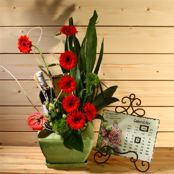 סידור יוקרתי בכלי קרמיקה מעוטר. הסידור בשילוב פרחי האנטוריום.