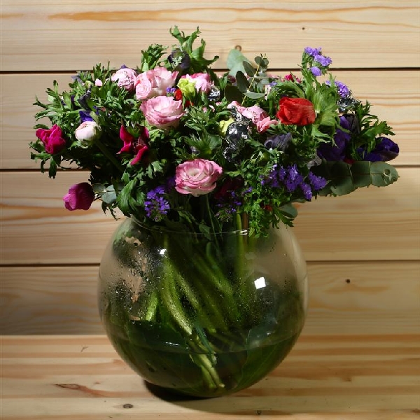 בוקה רענן המורכב מפרחי שדה חורפיים- כלניות, נוריות וירק ליווי. אפשרי להרכיב את הזר מפרחים וצבעים שונים בהתאם לעונה